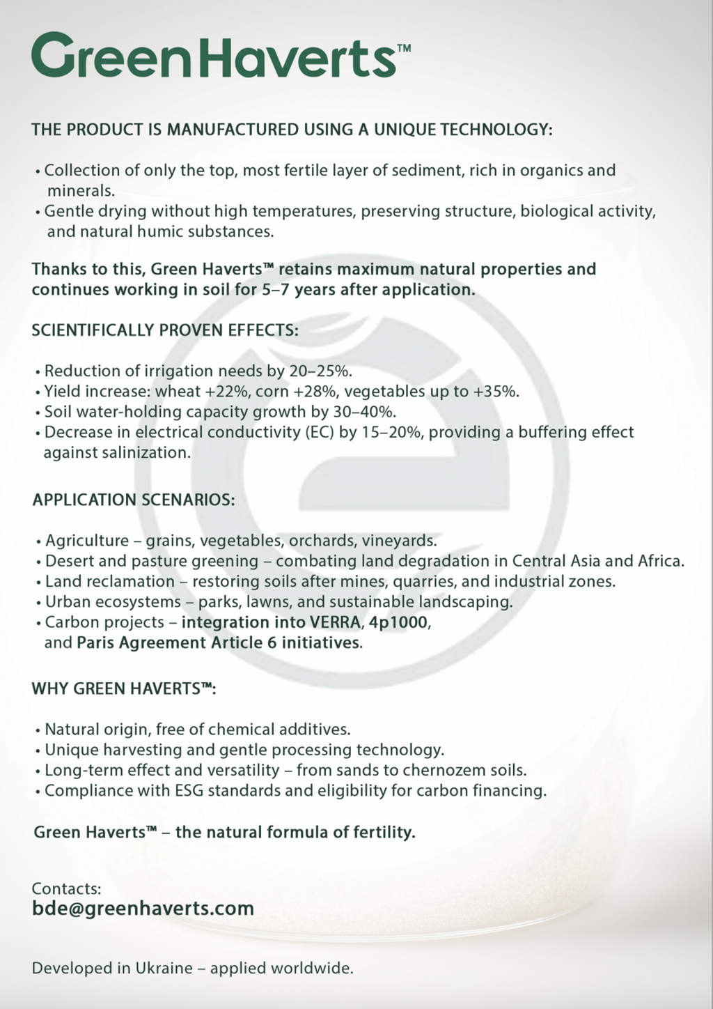 GREEN HAVERTS™ transforms natural freshwater sediments into a high-performance organo-mineral amendment that restores degraded soils, strengthens ecosystem resilience, and supports climate-positive land use. Its multifunctional composition enhances soil fertility, water retention, and carbon sequestration across agricultural, industrial, and ecological applications. From regenerative farming and wetland recovery to green construction and MRV-based carbon projects, GREEN HAVERTS™ provides a scalable, science-based solution for sustainable land and resource management.